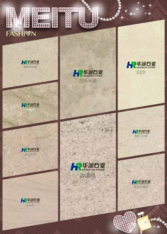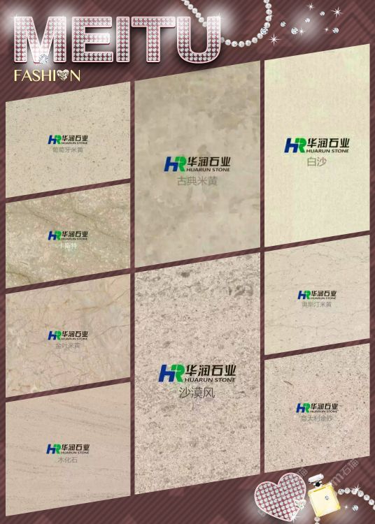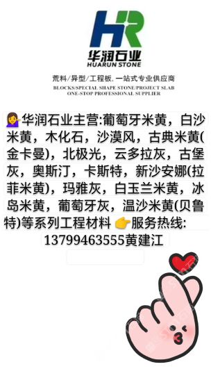 華潤石業(yè)主營:葡萄牙米黃,白沙米黃,木化石,沙漠風(fēng),古典米黃,北極光,云多拉灰,奧斯汀米黃,卡斯特米黃,貝魯特等工程系列石材。