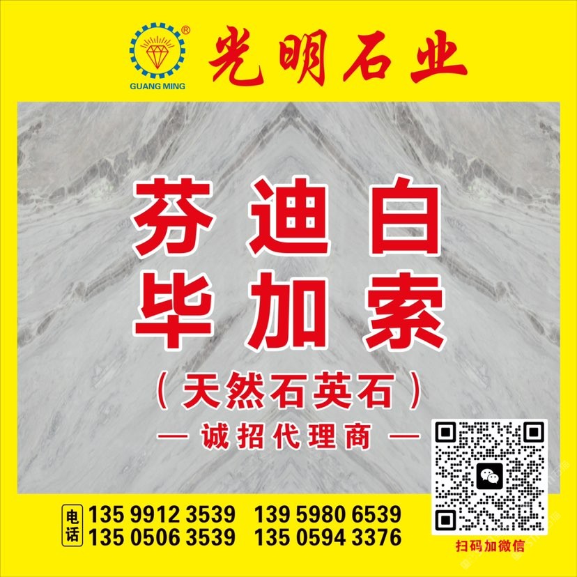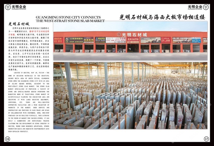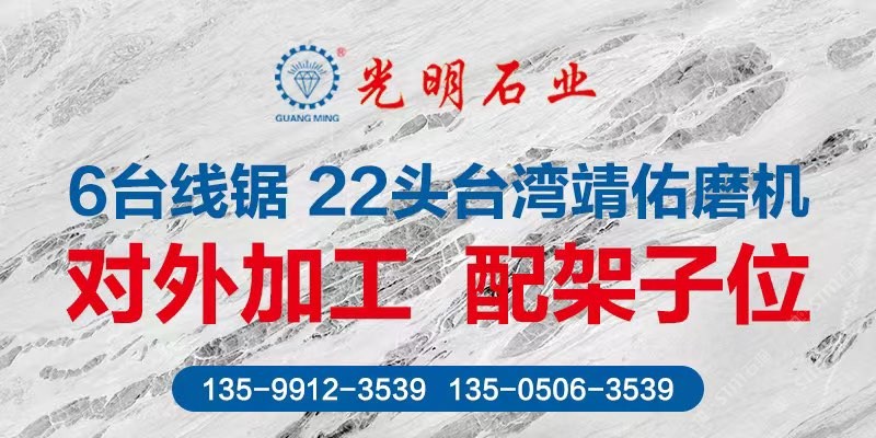 公司主要生產(chǎn)加工國內(nèi)外大理石、花崗巖、工程板、臺(tái)板、異形線條及地鋪石系列,目前擁有一系列先進(jìn)生產(chǎn)設(shè)備,具備加工優(yōu)質(zhì)石材的能力,可加工各種規(guī)格平板、弧形及異形板,承包國內(nèi)外多座大理石、花崗巖礦山,荒料庫存達(dá)數(shù)十萬立方,大板庫存量達(dá)幾十萬平方,可承接國內(nèi)外各種大型工程。多年來先后在北京、上海、浙江、天津、廣東、江蘇、湖北、四川、新疆、江西等地設(shè)立分公司,健全了公司的銷售網(wǎng)絡(luò),使光明的品牌深入人心,產(chǎn)品深得廣大顧客的一致好評。良好的信譽(yù)也使公司先后榮獲“文明經(jīng)營戶”、“誠信單位”、“明星企業(yè)”、“石材之星”、“全國質(zhì)量信得過產(chǎn)品”、“全國質(zhì)量服務(wù)消費(fèi)者滿意企業(yè)”、“守合同、重信用單位”的榮譽(yù)稱號,并通過了DHSAS18001健康管理體系認(rèn)證、GB/TI9001-2000-ISO9001:2000質(zhì)量標(biāo)準(zhǔn)和ISO14001:2004環(huán)境管理體系認(rèn)證。\\\\\\\\\\\\\\\