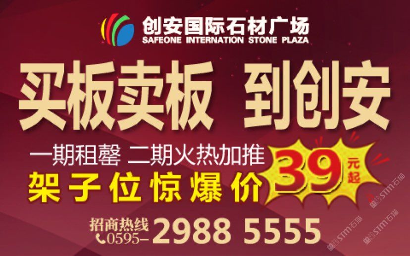 創(chuàng)安國際石材廣場位于水頭石材新集散區(qū)的核心地段,水頭石材展覽中心附近,周邊多個石材市場相互引流,采購客流密集。 廣場總體規(guī)劃建筑面積7萬㎡,一期大理石板區(qū)4萬㎡,二期精品玉石奢石區(qū)1.5萬㎡,三期石雕-石材文化區(qū)1.5萬㎡,打造為集石材展示銷售、設(shè)計(jì)體驗(yàn)、物流配送于一體的綜合性石材市場,石材品種豐富,采購商一站式即可購齊;廣場高標(biāo)準(zhǔn)建設(shè),挑高10米,采光充足,全場油漆,寬敞明亮;“兩橫七縱”市場道路,裝車通道15米超大路寬,小車通道6-10米面寬,保證雙向會車無阻,駕車采購與運(yùn)貨都非常便利。 市場配備獨(dú)立的辦公崗?fù)?,商家可根?jù)需求進(jìn)行布置,現(xiàn)場提供火車頭展架,可直接進(jìn)場擺貨;裝車通道門口100T地磅實(shí)時服務(wù)。廣場內(nèi)部建設(shè)多個獨(dú)立的綠色休閑生態(tài)區(qū),布置灌木、喬木、花草及舒適的休閑座椅,提升購物環(huán)境,凈化空氣。 市場采用“商業(yè)管理 物業(yè)管理”雙管家的管理模式。統(tǒng)一標(biāo)識系統(tǒng),商家產(chǎn)品整齊擺放,保潔每日進(jìn)行公共區(qū)域清洗,裝卸車后及時打掃,保安24小時巡查監(jiān)控,專業(yè)吊卸團(tuán)隊(duì)提供安全、高效的裝車服務(wù)。一切以客戶需求為導(dǎo)向,提供精細(xì)化服務(wù); 互利共贏,攜手共進(jìn),商家有生意,市場才能長久發(fā)展。本市場全方位推廣宣傳,為商家?guī)韺?shí)實(shí)在的采購客流。本市場已經(jīng)和石材網(wǎng)站“石貓網(wǎng)”達(dá)成長期戰(zhàn)略合作,將在其網(wǎng)站上免費(fèi)為入駐商家提供宣傳,項(xiàng)目自媒體平臺及市場廣告位也將為商戶提供推廣服務(wù)。