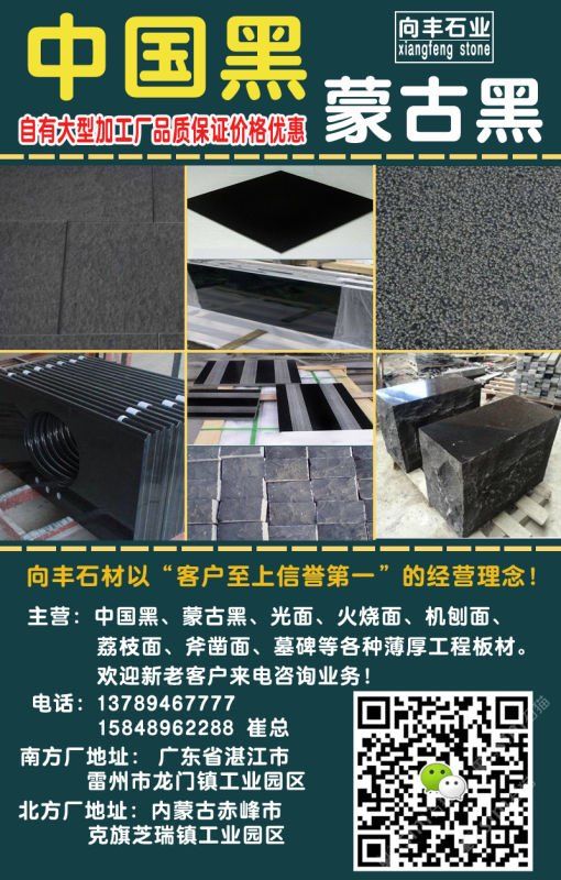 向豐石材有限公司成立于2005年,是一家礦山自營的蒙古黑板材加工企業(yè)!主營項(xiàng)目:各種薄厚工程板、光面、火燒面、機(jī)刨面、荔枝面、斧鑿面、墓碑等。向豐石材以“客戶至上信譽(yù)”的經(jīng)營理念,先進(jìn)的技術(shù)和現(xiàn)代化管理為基石,不斷的開拓創(chuàng)新與時(shí)俱進(jìn)?,F(xiàn)已經(jīng)發(fā)展為南北方跨區(qū)域生產(chǎn)企業(yè),至今完成多個(gè)大型項(xiàng)目并多次中標(biāo)。高效的生產(chǎn),優(yōu)質(zhì)的產(chǎn)品得到業(yè)主單位的好評,樹立了良好的企業(yè)形象。我們堅(jiān)信,以“質(zhì)量求生存,誠信為根本”一定會(huì)贏得更好的明天!