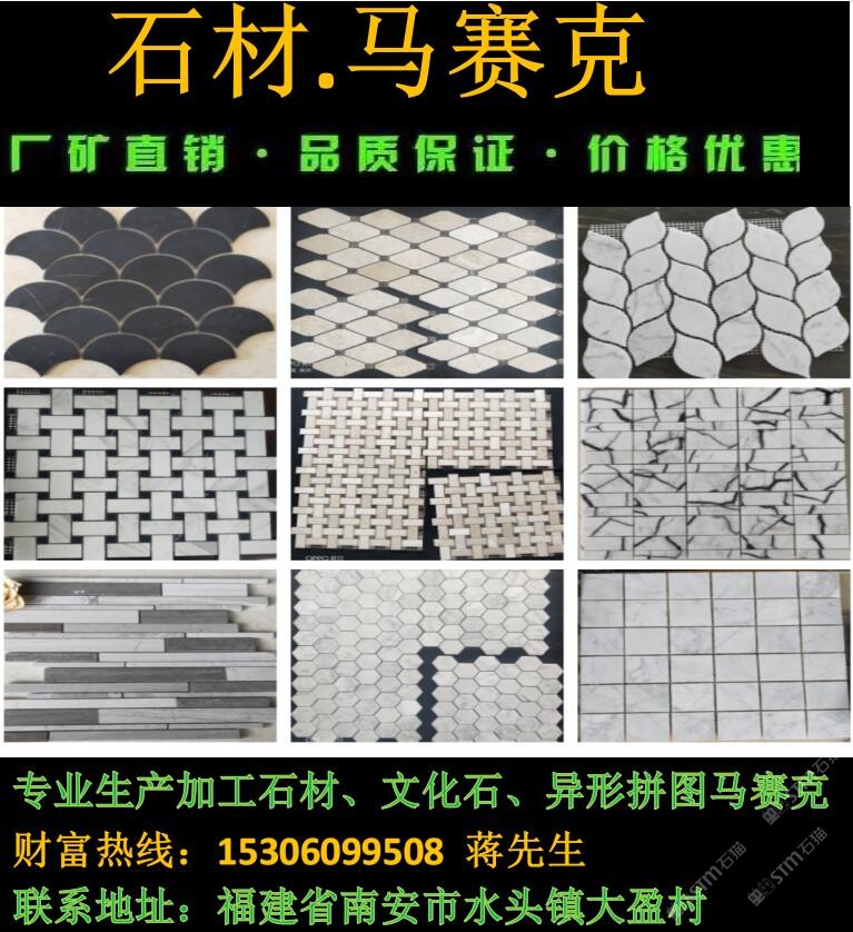 廈門摩恩石材馬賽克工廠是生產(chǎn)馬賽克、大理石、拼花、石線等石材的專業(yè)工廠,工廠成立15年誠(chéng)信合作,價(jià)格公道,以質(zhì)量求生存,歡迎來(lái)廠參觀、詢價(jià)、考察下單。我們的工廠負(fù)責(zé)人蔣先生隨時(shí)恭候您的光臨,電話:15306099508,微信:15306099508 qq:1043118173