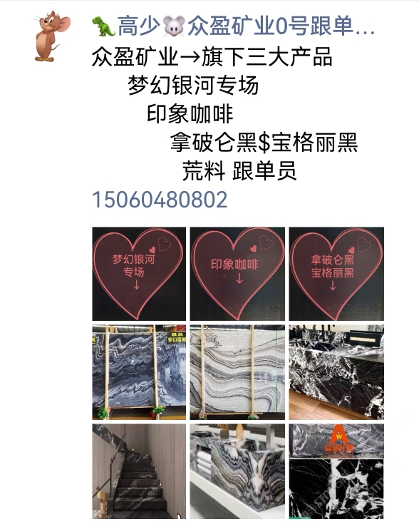 眾盈礦業(yè)主營:夢(mèng)幻銀河專場(chǎng),、新品意大利黑白(寶格麗黑/拿破侖黑)、新品→印象咖啡(紫山水),潘多拉,宇宙灰(鮑魚石)