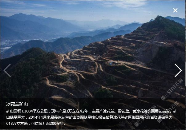 位于四川省攀枝花市米易縣,本公司專業(yè)做花崗石礦山開采、花崗石板材生產(chǎn)及銷售。與廈門萬里石股份有限公司合作開采“冰花藍(lán)”寨子山礦山,與高時石材米易愉天礦業(yè)合作開采“冰花藍(lán)”石板溝礦山,并自有“豹皮花”礦山和米易東成礦業(yè)。年產(chǎn)花崗石荒料3萬立方,在米易長坡工業(yè)園區(qū)控股三個工廠合計面積120余畝。年產(chǎn)花崗石板材80萬平米。旗下主要產(chǎn)品:“冰花藍(lán)”、“豹皮花”、“芝麻黑”、“芝麻灰”。產(chǎn)品主要用于大樓外墻干掛、廣場地鋪、路緣石、墓碑石、景觀園林用石等。