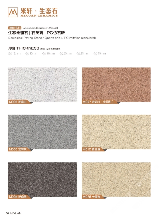 工廠主要生產(chǎn):PC磚、生態(tài)地鋪石,幕墻干掛仿石磚、園林景觀磚、石英磚等。 工廠現(xiàn)有4條行業(yè)進生產(chǎn)線,日產(chǎn)5萬平米,可同時在線生產(chǎn)7款不同規(guī)格,不同厚度產(chǎn)品