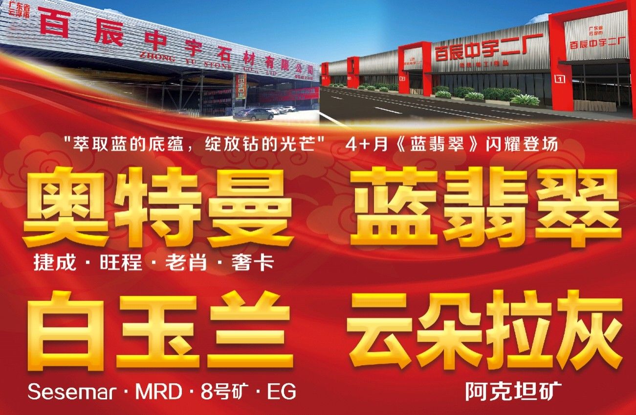 百辰中宇石業(yè)有限公司:源于2010年,至2018年擁有云浮河口工廠、水頭永泉山一廠和水頭福山工業(yè)區(qū)百辰中宇二廠。總計17臺切機,5臺線鋸,4臺立體烘干線,5臺磨機。年產(chǎn)量可達到160萬平起。 主營產(chǎn)品為:奧特曼所有礦囗、白玉蘭、云朵拉灰、云多拉灰、奧特曼灰、巴寶莉粉等
