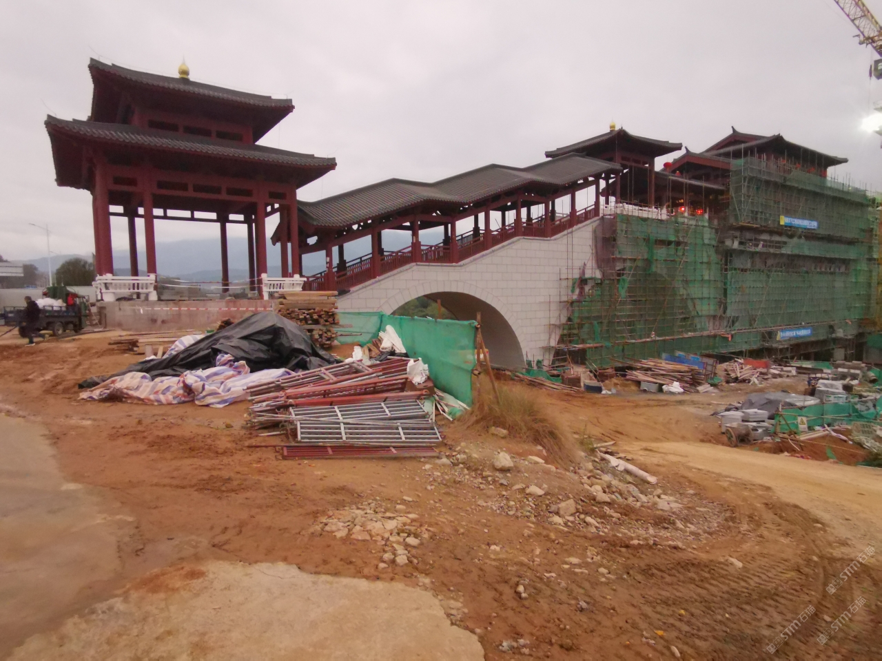 廊橋外墻干掛石材,地鋪青石