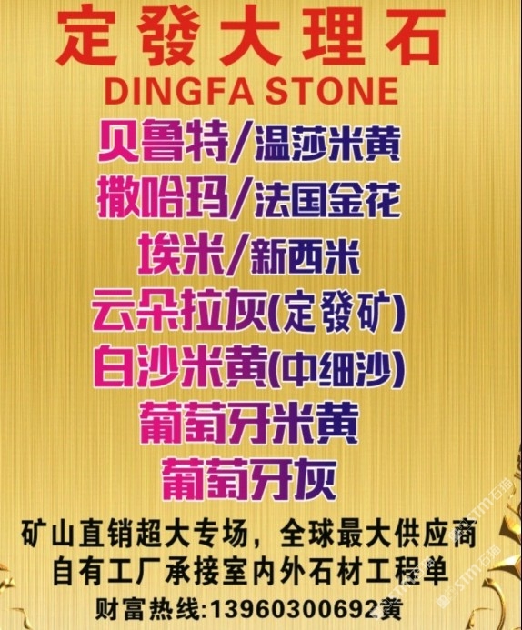 發(fā)布信息: 貝魯特/溫莎米黃,工程外墻干掛? 葡萄牙米黃/葡米,工程外墻干掛★ 撒哈瑪/法國(guó)金花,室內(nèi)外材料?? 埃米、新西米,超白低室內(nèi)外材料★ 云朵拉灰,專為工程而打造,超性價(jià)比 白沙米黃/中細(xì)沙,室內(nèi)外材料?? 令每個(gè)工程交付,做到驗(yàn)收無(wú)憂???? (質(zhì)與量的保障者、經(jīng)得起層層考驗(yàn))???? 全球供應(yīng)商,各大地產(chǎn)指定供應(yīng)商? 承接國(guó)內(nèi)外室內(nèi)外石材工程訂單???? 致富專線:13960300692黃