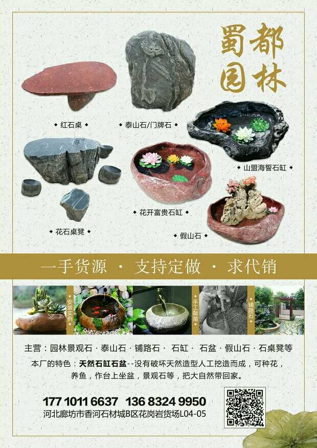 蜀都 聯(lián)系人:武先生    136****9950 查看 177****6637 查看 主營范圍: 環(huán)境石材、石材工藝品、石材外貿(mào)、石材輔料及特殊工藝、石材雕刻、 企業(yè)地址:河北廊坊香河市安平鎮(zhèn)香河石材城B區(qū)花崗巖貨場L04-05~順著一排綠樹走到頭就是