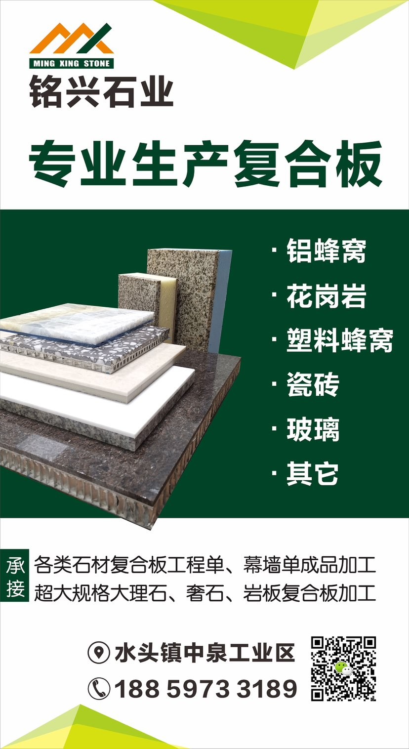 發(fā)布信息: 【銘興復(fù)合板】專業(yè)加工各類石材復(fù)合板 1.大理石/花崗巖復(fù)合板工程單、幕墻單! 鋁蜂窩板、花崗巖、瓷磚,玻纖蜂窩板,人造石、玻璃等 2.各類超大規(guī)格石材復(fù)合板 供應(yīng)各類石材復(fù)合板成品,來料加工!