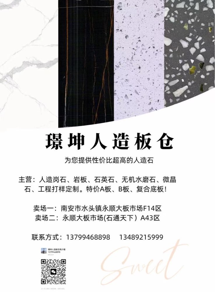 發(fā)布信息: 一璟坤人造板倉一 主營:人造崗石,石英石,巖板,無機水磨石, 微晶石,工程打樣定制,特價A板,B板,復合底板 賣場地址:福建省南安市水頭鎮(zhèn)永順大板市場A43區(qū),F(xiàn)10一F14區(qū)。財富熱線:13799468898高先生