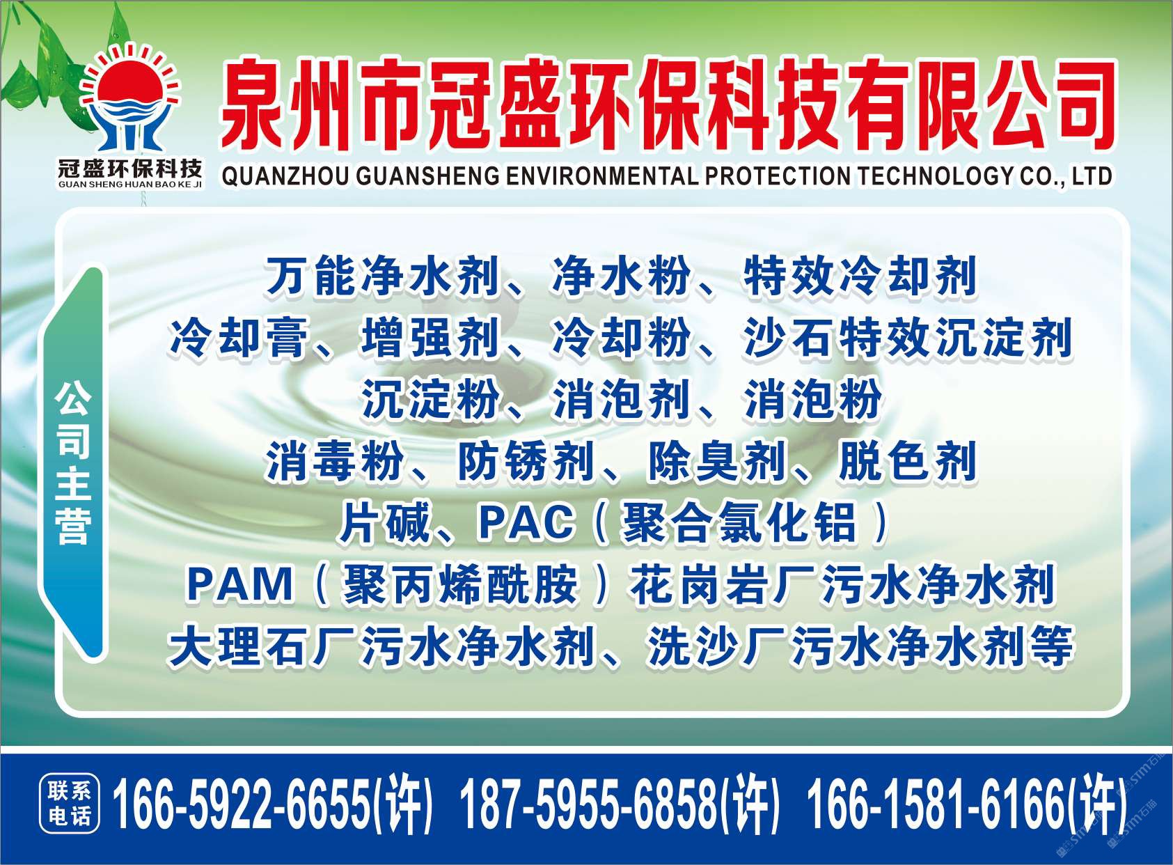 冠盛水處理材料批發(fā)部【環(huán)境污染處理材料】 聯(lián)系人:許天灌    153****6521 查看 166****6655 查看 主營范圍: 其他、石材輔料及特殊工藝、更多、環(huán)境石材、 企業(yè)地址:福建南安石井鎮(zhèn)院下村新街308-11號(冠盛環(huán)??萍迹?/span>