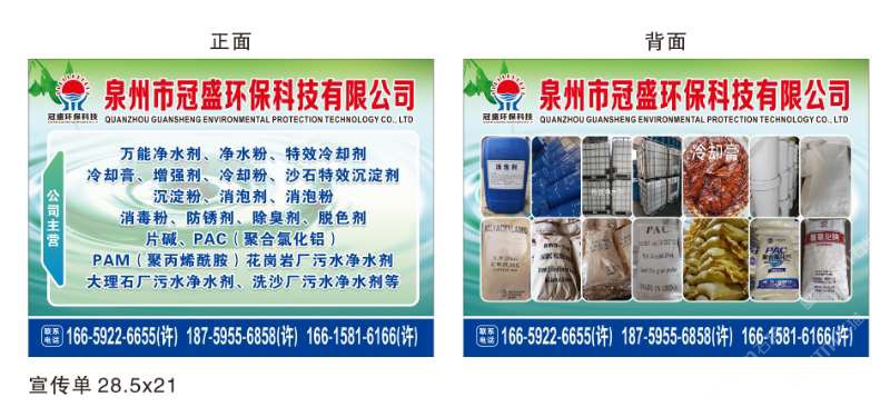 發(fā)布信息: 冠盛環(huán)保科技16659226655 主營產(chǎn)品:凈水劑,冷卻劑,冷卻粉,大理石人造石專用凈水劑,沉淀粉,消泡劑,消毒凈水劑,防銹凈水劑,除銹劑,除臭劑,聚丙烯酰胺,聚合氯化鋁,鹵精,洗沙專用凈水劑,壓濾機專用凈水劑,陶瓷廠專用凈水劑(黃藥 白藥)等所有水處理環(huán)保材料……