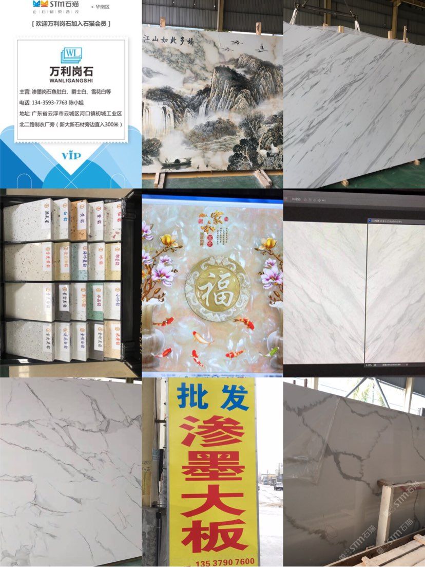 云浮市萬利崗石 聯(lián)系人:林總    135****7600 查看 手機號碼:無 主營范圍: 大板批發(fā)、人造石加工、 企業(yè)地址:廣東云浮云城區(qū)河口鎮(zhèn)初城工業(yè)區(qū)北二路制衣廠旁(新大新石材旁邊直入300米)