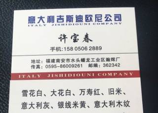 意大利石業(yè)主營(yíng)產(chǎn)品:雪花白,雪花白3,魚肚白,魚肚白(崗石),意大利灰31,大花白(大理石),銀線米黃,意大利黑金花,舊米黃,萬(wàn)壽紅,帝諾米黃(直紋)企業(yè)地址:福建泉州南安市水頭鎮(zhèn)蟠龍瀚輝廠